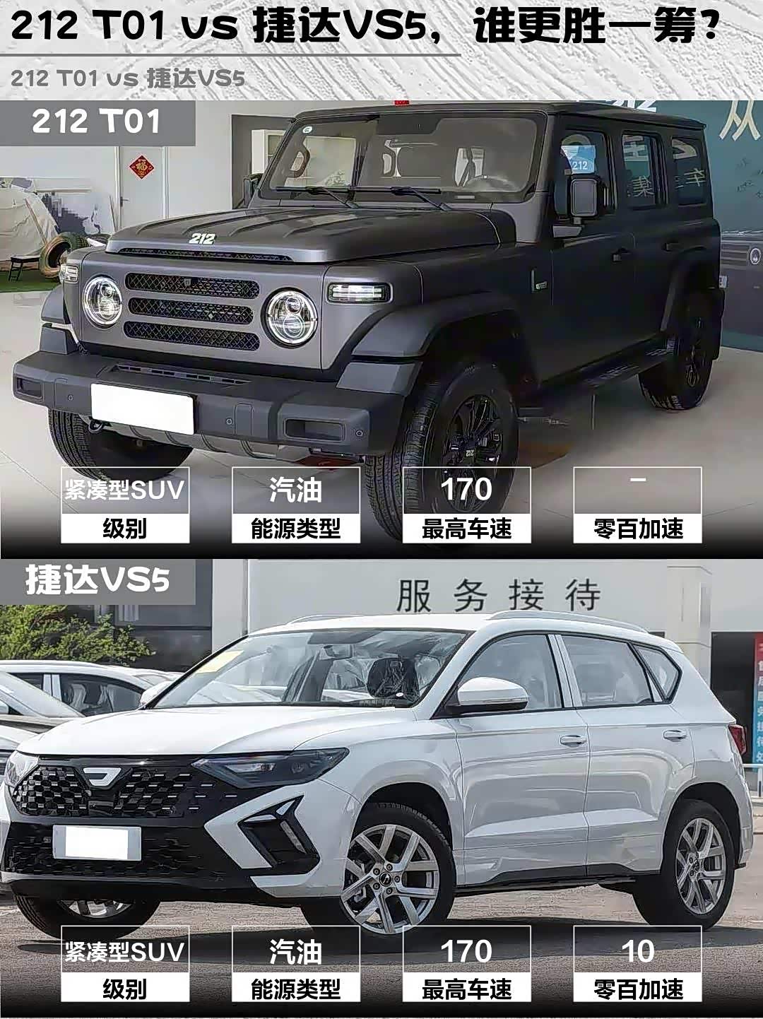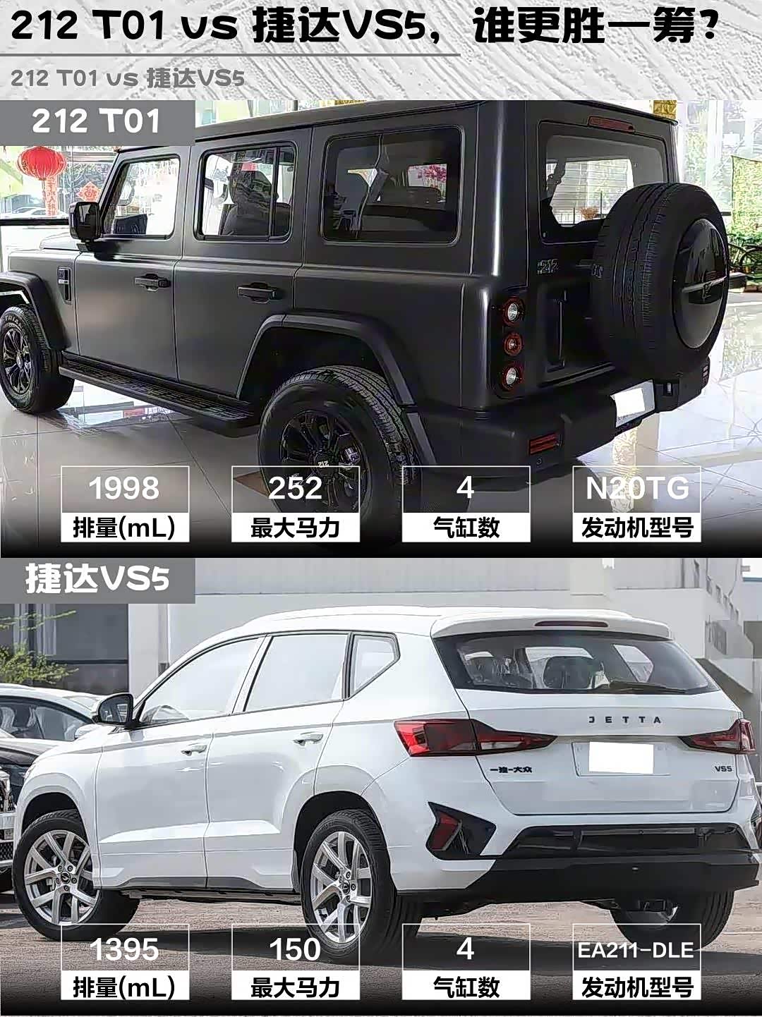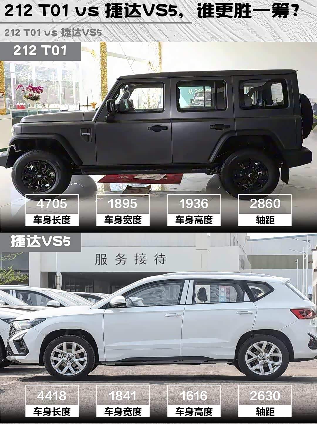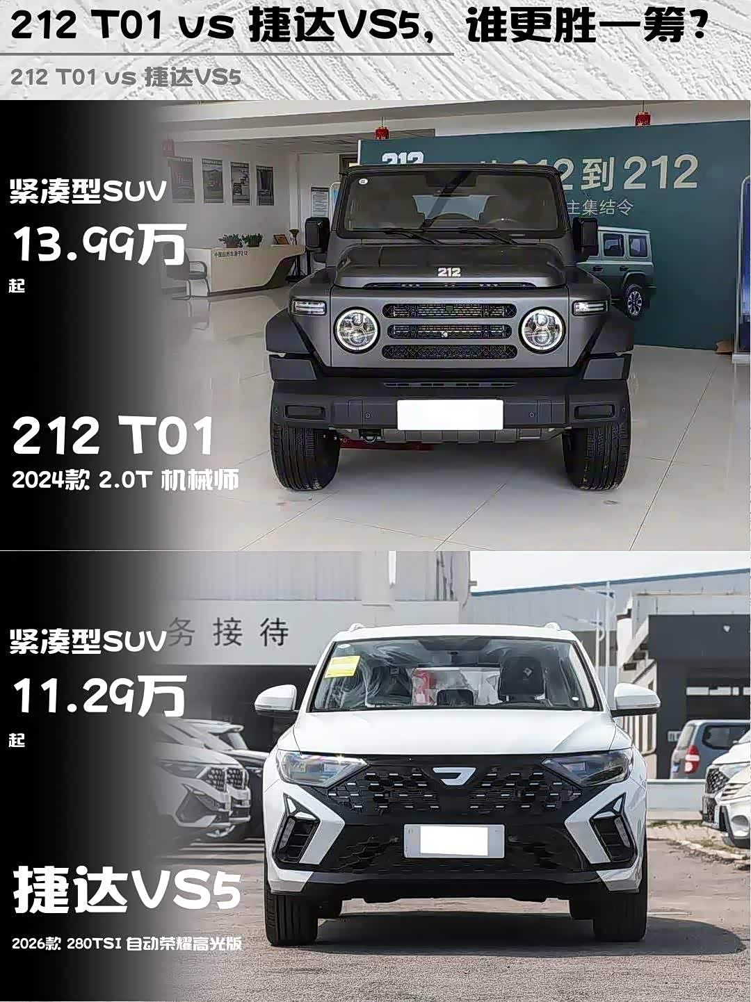 最近陪朋友看车,发现硬派越野和城市SUV的对比太有意思了!今天拿 212 T01(参数|询价) 2024款 2.0T机械师和捷达VS5 2026款280TSI自动荣耀高光版来场硬核PK,看完你就知道该为情怀买单还是向实用低头👇