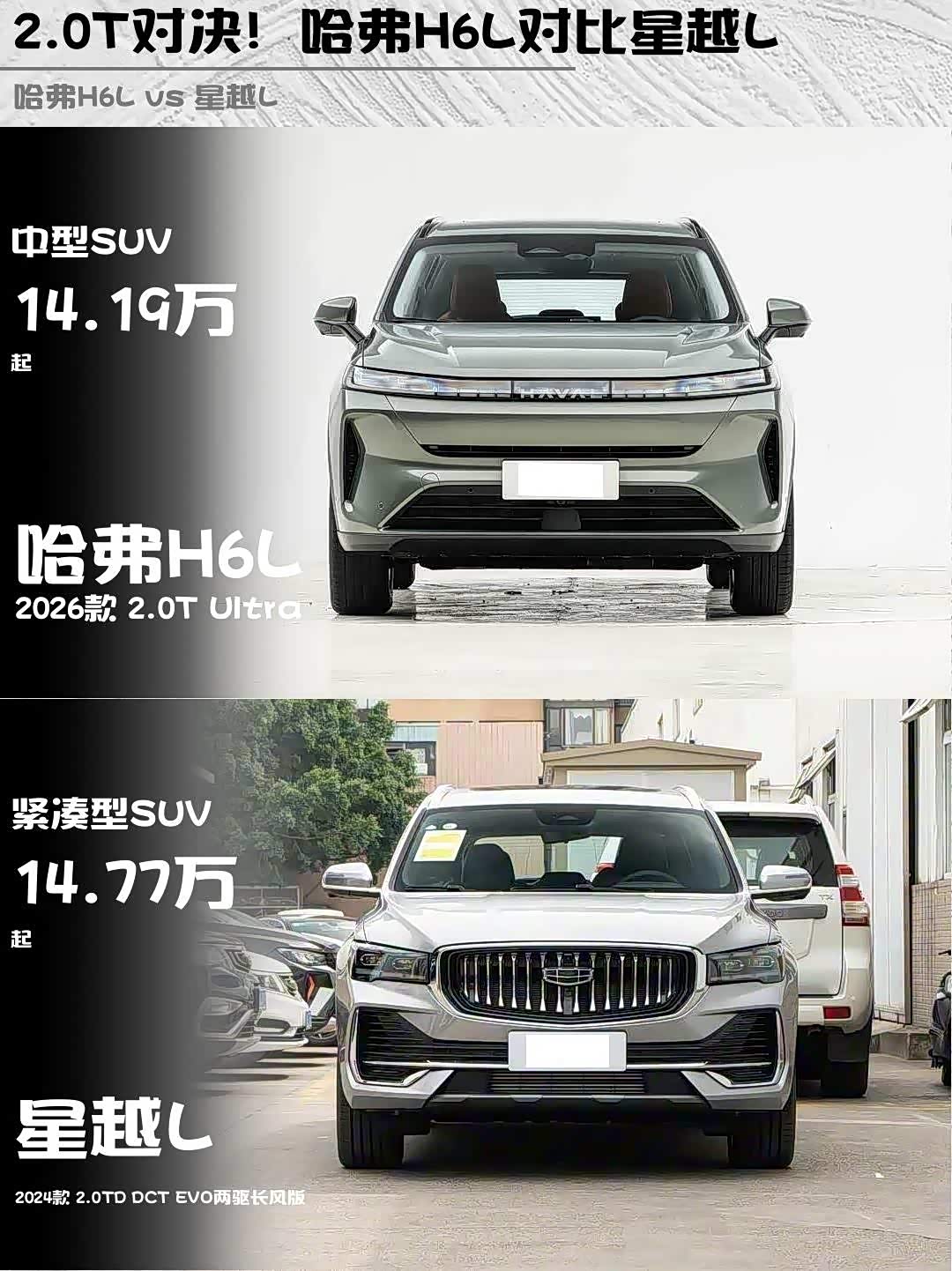 最近在选15万级SUV的朋友看过来!今天深度对比两款热门国产2.0T选手—— 哈弗H6L(参数|询价) 2026款 2.0T Ultra和星越L 2024款 2.0TD DCT EVO两驱长风版,实测干货直接上硬菜🔥