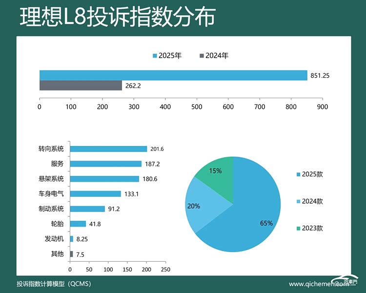 汽车质量投诉点评:去年,理想L8的投诉指数达到了851.25,同比涨超2倍。从投诉反馈来看,该车也因下摆臂异响和新车降价遭到投诉。有车主表示,自己购买的理想L8智能焕新版不到一个月就出现问题,车辆在低速转弯、刹车及倒车上坡等场景下,底盘持续发出“嘎吱”声。此外,新车降价也遭到了车主投诉。去年10月,理想汽车发布大额保险补贴政策,理想L8终端累计优惠高达4万元(含官方降价、置换补贴、保险补贴等),这一举动引发老车主不满。