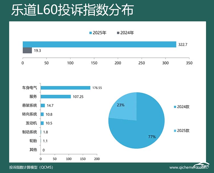 汽车质量投诉点评:2025年,乐道L60的投诉指数同比涨超15倍,经销商不退订金、部件开裂、座椅故障、驾驶辅助故障是车主投诉的主要原因。有车主投诉称,购车时销售承诺贷款不通过可退订金,但真当事情发生时又拒绝退款。部件开裂则主要表现为玻璃天幕有条纹,2024款和2025款均有涉及。座椅故障和驾驶辅助故障也遭到车主投诉,但整体投诉量并不高。