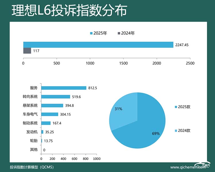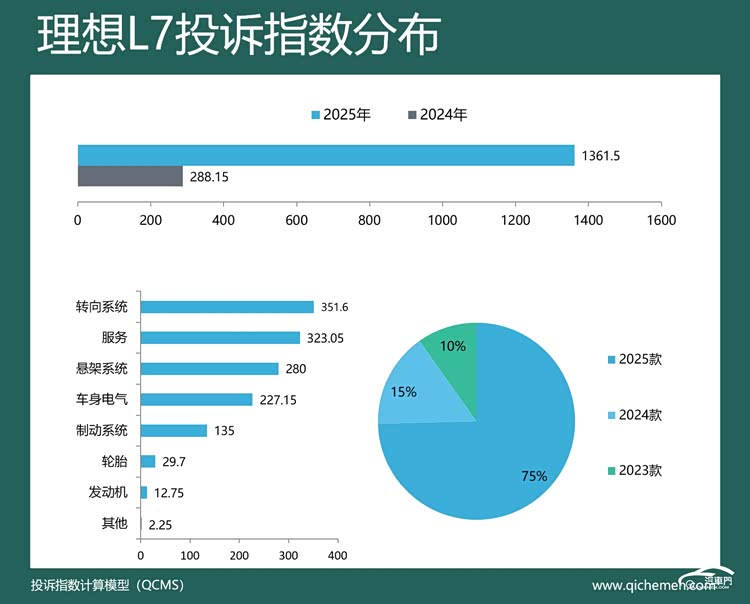 汽车质量投诉点评:2025年,理想L7的投诉指数达到了1361.5,同比涨超3倍,下摆臂异响和新车降价的问题也同样在该车上存在。从投诉反馈来看,有关下摆臂异响的投诉指数达到了683.9,占比50%。有车主投诉称,理想L7智能焕新版仅在提车两周后底盘便出现异响声。此外,新车降价也遭到车主投诉,占比17%。