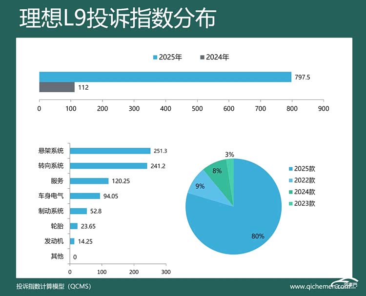 汽车质量投诉点评:2025年,理想L9的投诉指数达到了797.5,同比涨超6倍,下摆臂异响和新车降价的问题同样出现在该车上。有车主投诉称,车辆在低速行驶时(<30km/h)底盘前部发出“咯吱咯吱”金属摩擦声或橡胶挤压声。此外,理想汽车去年10月发布的大额保险补贴政策也包含了理想L9,该车叠加补贴后直降4.5万元,此举被老车主大量吐槽。