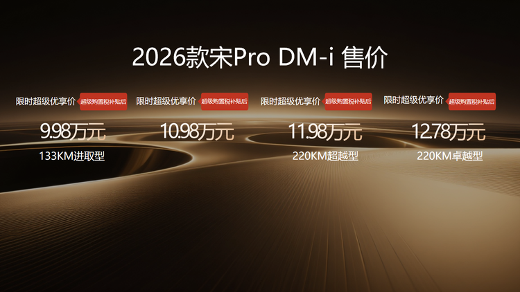 价格方面,2026 款秦 PLUS DM-i 以 7.98 万元的亲民定价击穿行业底线,秦 L DM-i 四款车型限时优享价9.28 万元- 12.28 万元,宋 Pro DM-i 则以 9.98 万元 - 12.78 万元的区间覆盖主流家庭需求,每一款都堪称越级超值。