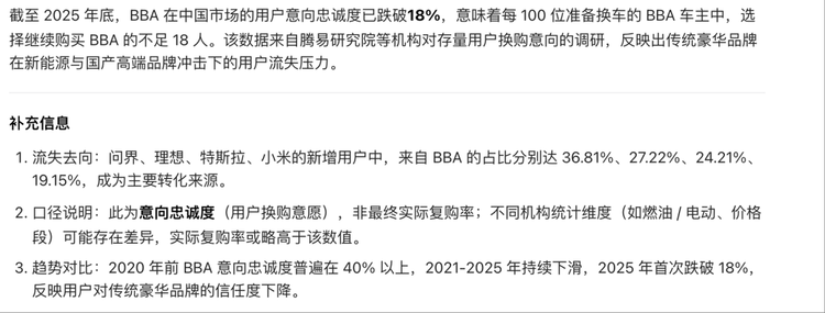 腾易研究院在2025年的调研报告中显示,截止到2025年年底,BBA的用户忠诚度已经跌破18%,这意味着每100个准备换车的BBA老车主中,还想买BBA的人,不到18个。