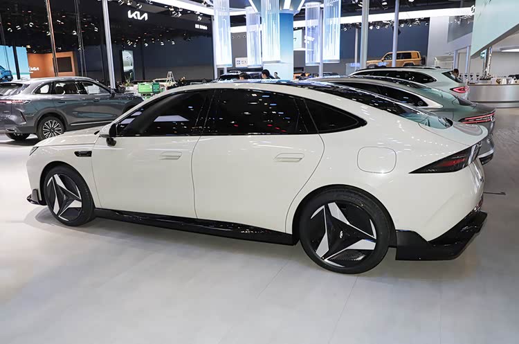 车身侧面是轿跑式设计风格,使用了短车尾的结构,后尾箱盖上部的亮黑色饰板和后风挡相呼应,营造出了大溜背式的效果。车身下部也带有突出的下包围,轮毂使用了半封闭式的低风阻设计,双色的涂装很抢眼。