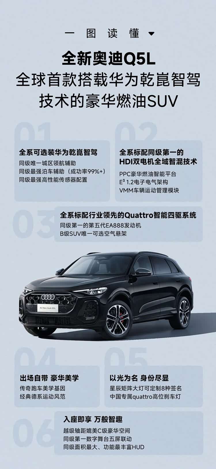 2026年1月15日,在华为乾崑与一汽奥迪合作推出的另一款车型——一汽奥迪全新 Q5L(参数|询价),即将可全系搭载乾崑智驾系统。