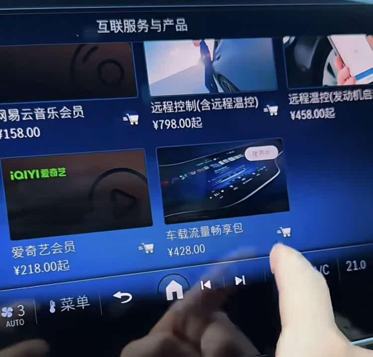 类似这样的收费项目还有十多个,车辆配备的数字化LED大灯,可以投出绚丽的灯效,但是得加钱,每年198元;放倒座椅并播放柔和音乐的“畅心醒神”模式,398元一年,永久买断要1698……