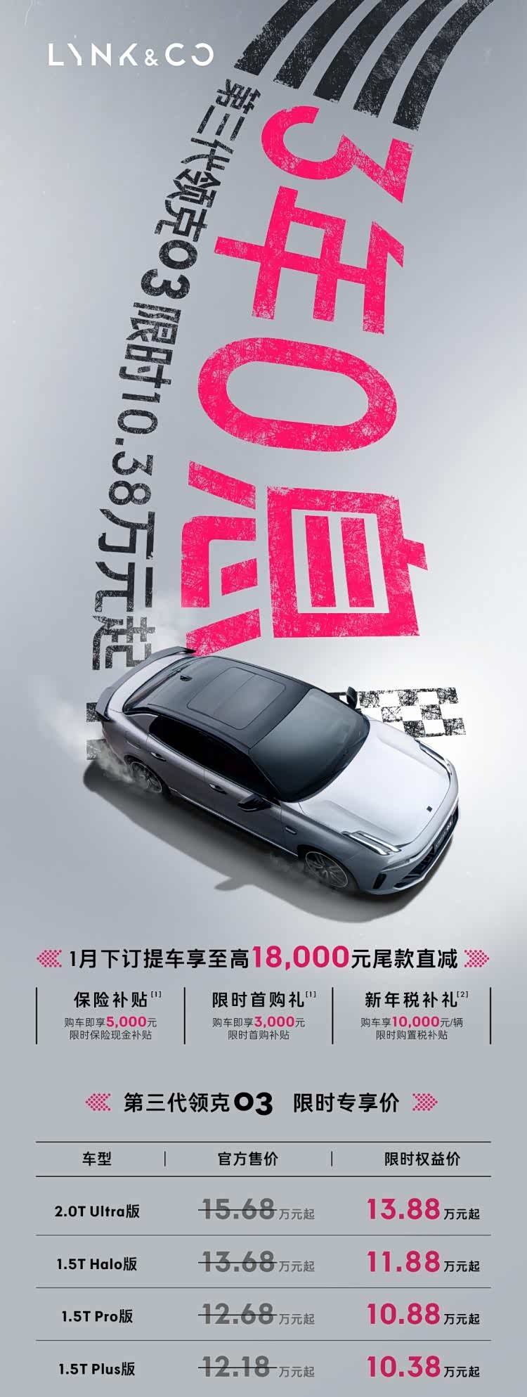 恰逢1月购车黄金期,领克03家族推出的亲民政策进一步降低了拥有门槛。10.38万元起的入门价格,叠加丰富的限时权益,让消费者轻松实现“开新车玩冰雪”的愿望。第三代领克03可选择“6万2年0息”或“5年贷3年0息”方案,支持0首付申请,极大减轻了年轻人的购车压力。新领克03+性能进阶版则直接享受“2年15万0息”福利,让性能车不再遥不可及。此外,保险补贴、置换补贴等多重权益,进一步提升了购车体验,让消费者在享受滑雪乐趣的同时,也能拥有更加省心、舒心的购车过程。