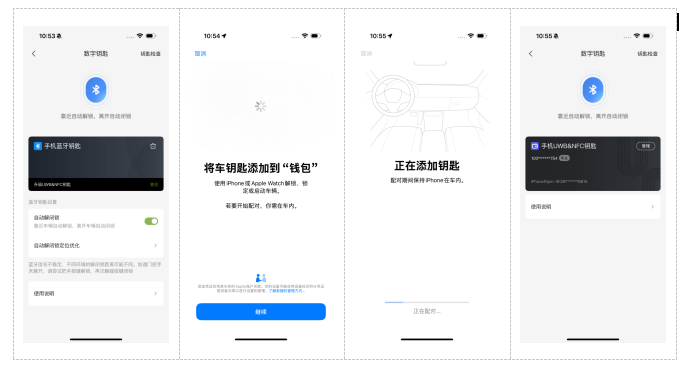 (1)iOS 用户:iPhone 11 及以上机型、Apple Watch Series 6 及以上机型均可开通 UWB&NFC 钥匙,支持将钥匙添加至苹果钱包,实现息屏解锁、低电关机刷卡等便捷操作,还能通过隔空投送、短信等方式,一键分享钥匙给家人朋友,轻松实现车辆共享。