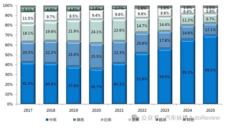 图表4:2017-2025年乘用车不同系别市场份额