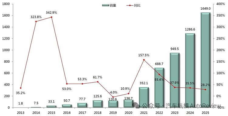图表3:2013-2025年中国新能源汽车销量走势