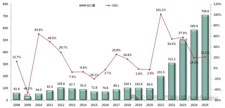 图表2:2008-2025年中国汽车出口量走势
