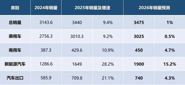 在公布2025年产销数据的同时,中国汽车工业协会还对2026年汽车市场进行了预测。据预计,2026年国产汽车总销量预计将达到3475万辆,微增1%。其中,乘用车预计为3025万辆,微增0.5%;商用车预计为450万辆,小幅增长4.7%;新能源汽车预计为1900万辆,增长15.2%;汽车出口量预计为740万辆,小幅增长4.3%。(见图表5)