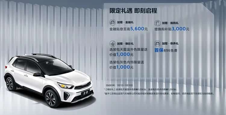 奕跑的优惠力度达到2.39万,5.59万的“一口价”让很多自主品牌SUV都汗颜,另外它还有3000元的增换购补贴,图中这天霜蓝的车漆色以及灰色内饰选装包都免费送,可见起亚的诚意还是很足的。