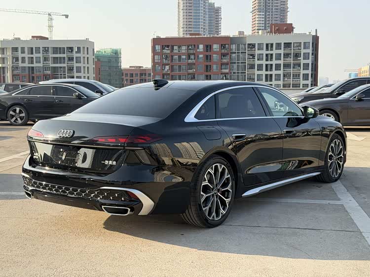 车身尺寸长宽高分别达到5142/1887/1464mm,轴距3066mm,相比现款奥迪A6L全面升级,也要大过奔驰E级。车身侧面继续采用修长的溜背式造型,并加入饱满的线条来刻画厚重感,而细节处的镀铬饰条点缀,继续强调尊贵气息。此外还换装了半隐藏式门把手、全新21英寸轮毂+红色卡钳以及双层贯穿式尾灯等时尚元素。黑光包则继续针对车身细节进行黑化处理,来营造运动气息。