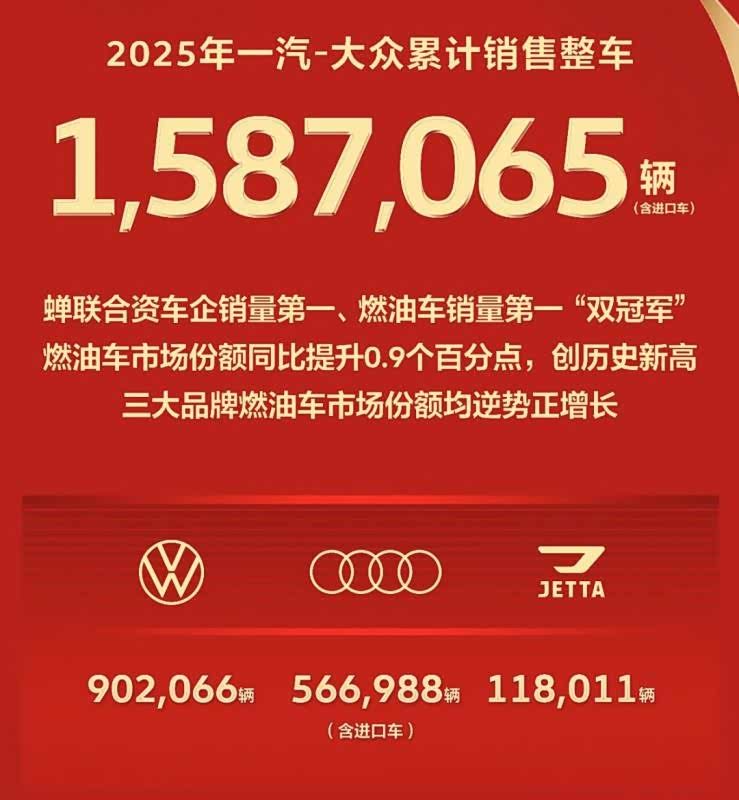 据官方数据,一汽-大众2025年整车销量达158.7万辆(含进口车),其中大众品牌全年交付量高达902,066辆,燃油车市场份额同比提升0.6个百分点,持续稳居国内燃油车市场第一阵营,为企业转型升级的关键之年奠定了坚实基础。