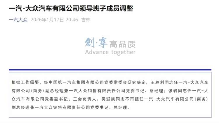 1月17日晚,一汽-大众发布一则领导班子调整公告。公告内容显示,王胜利接替吴迎凯出任一汽-大众汽车有限公司(商务)副总经理兼一汽大众销售有限责任公司党委书记、总经理。与此同时,张岩出任一汽-大众汽车有限公司党委副书记、工会负责人。