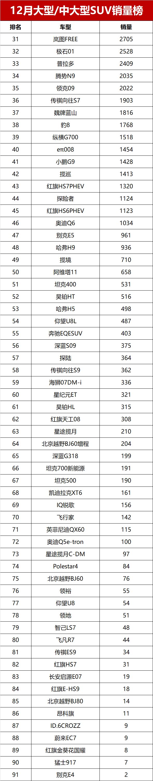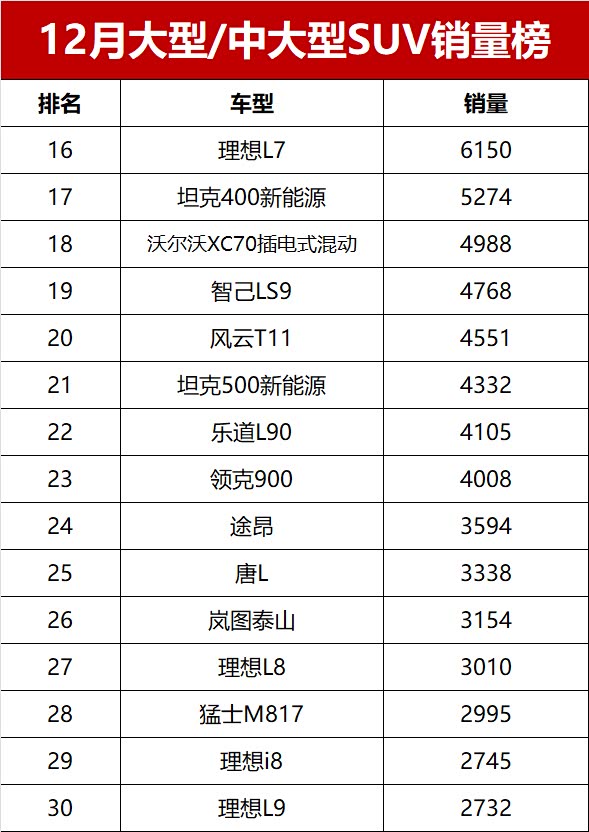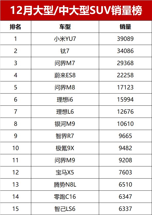 蔚来ES8以22258辆排第四,也是前五名里唯一一款纯电大型SUV。问界品牌本月的表现堪称惊喜,妥妥的集团作战优势,M8卖了17123辆排第五,M9也有9208辆进了第十一位,三款车都挤在前十一,直接助推问界12月交付量突破5.7万辆,创下单月新高。其中问界M9更是强势,连续20个月霸占50万元级以上豪华SUV销量榜首,累计交付超26万辆,用户口碑一直很稳。