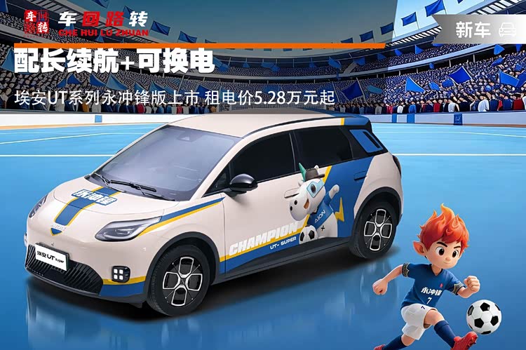 近日,广汽埃安UT系列永冲锋版正式上市,新车提供换电与充电两种补能方式,共3款配置车型。其中埃安UT永冲锋版指导价8.68万元;埃安UT super永冲锋版整车售价9.28万元,电池租用售价5.28万元。此次上市的新车命名源自广汽埃安UT系列与湘超冠军永州足球队的战略合作,意欲将科技基因与拼搏精神完美融合,为用户提供“国民好车”。