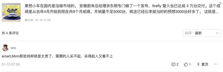 不过,作为后来者QQ3和两款“成功者”相比也不是尽是优点。首先,从电池上吉利星愿标配宁德时代的电芯,标称超400公里的续航是不少消费者最后选择星愿的重要砝码;而QQ3的电池目前信息是来自国轩高科,虽然还没有续航的信息,但在动力电池这块儿,国轩高科和宁德时代是差着“咖位”的。 萤火虫更不用说,蔚来庞大的换电网络就是它的保证之一。最最重要的是价格,这才是终极武器。星愿能够成功的重要原因就是6.58万你能买到那么大一个车。而过去精品小车的代表smart、MINI的销量低迷的原因之一也是价格,贵。