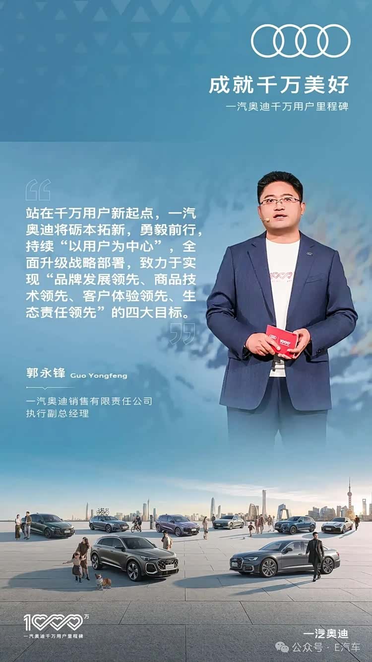 当用户从头到尾参与其中,与一汽奥迪共贺庆典的时候,一汽奥迪销售有限责任公司执行副总经理郭永锋则进一步明确了品牌的发展方向:站在千万用户新起点,一汽奥迪将砺本拓新,勇毅前行,持续“以用户为中心”,全面升级战略部署,致力于实现"品牌发展领先,商品技术领先,客户体验领先,生态责任领先"的四大目标。