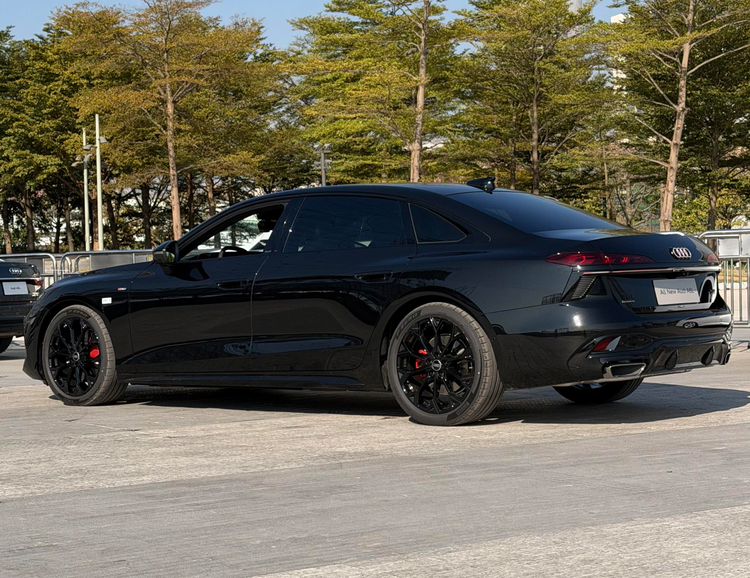 尺寸是这一代A6L最直观的升级点。5142毫米的车长、3066毫米的轴距,不仅全面超越现款,也已经压过奔驰E级一头。侧面依旧是熟悉的修长比例,但线条更加饱满,强调厚重感而不是单纯的“长”。半隐藏式门把手、21英寸轮毂配红色卡钳、双层贯穿式尾灯,这些细节让它在稳重之外,多了明显的时代感。黑光包版本继续通过细节黑化,把运动气质推得更靠前。