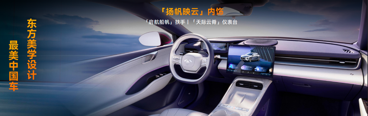内饰方面,风云 A9 采用「杨帆映云」内饰设计,整体的设计比较简约,围绕悬浮式中控屏展开。