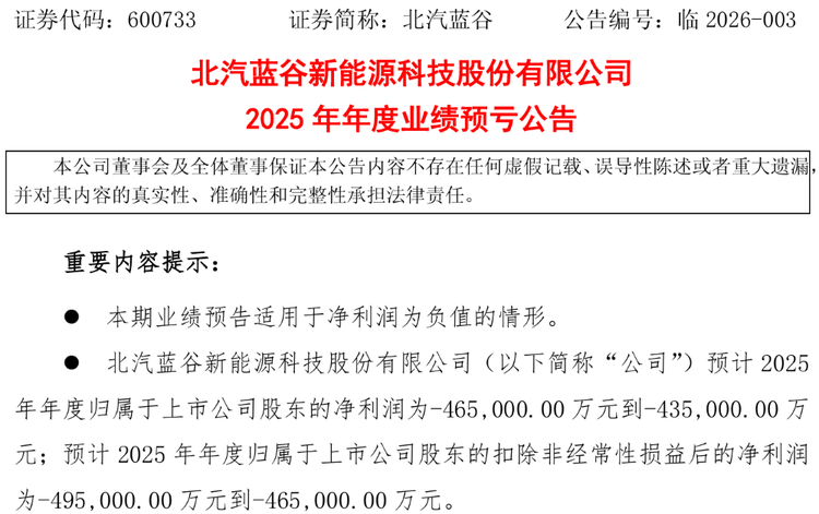 ▲北汽蓝谷发布2025年年度业绩预亏公告