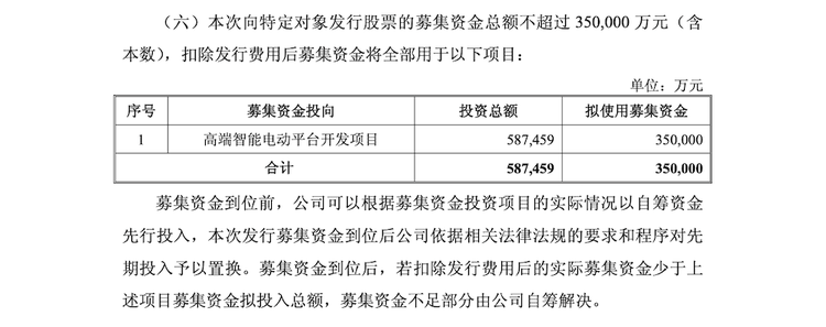 该说明书指出,江淮汽车向特定对象发行股票的募集资金总额不超过35亿元,扣除发行费用后将全部用于高端智能电动平台开发项目,该项目投资总额预计达到58.75亿元。