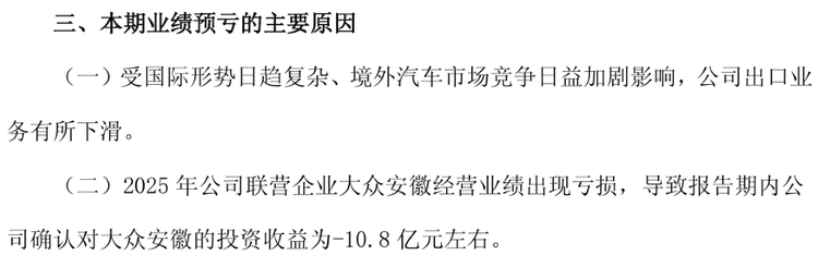 2、2025年江淮汽车联营企业大众安徽经营业绩出现亏损,导致报告期内江淮汽车确认对大众安徽的投资亏损为10.8亿元左右。