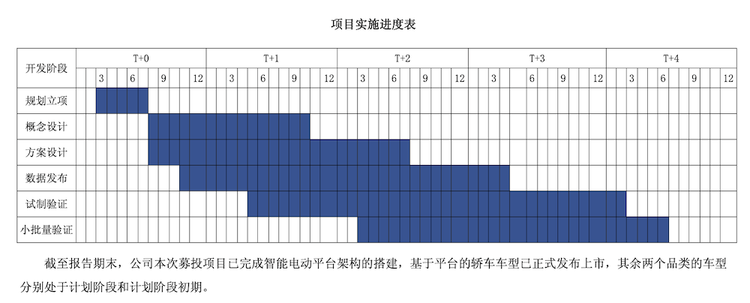 值得注意的是,官方文件中写明,截至报告期末,募投项目已完成智能电动平台架构的搭建,基于平台的轿车车型已正式发布上市,其余两个品类的车型分别处于计划阶段和计划阶段初期。