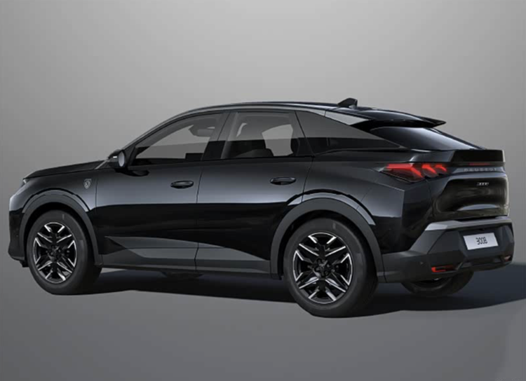 来到车身侧面,标致3008 GT HYBRID Black Edition采用了黑色的车漆涂装,倾斜的A柱与弧线形的车顶一气呵成,车窗上沿还加入了一条弧线形的灰色装饰条,提升了整车的层次感,黑色加宽的B柱/C柱也带来了十足的立体感。车身加入了锋利的腰线设计,渐进式的轮眉搭配着内收的车身线条,标配了19英寸的熏黑铝合金轮圈,并加入了四星放射状设计,从轮圈尺寸和样式判断,其定位更偏向城市道路使用而非极端性能需求,更有视觉张力。