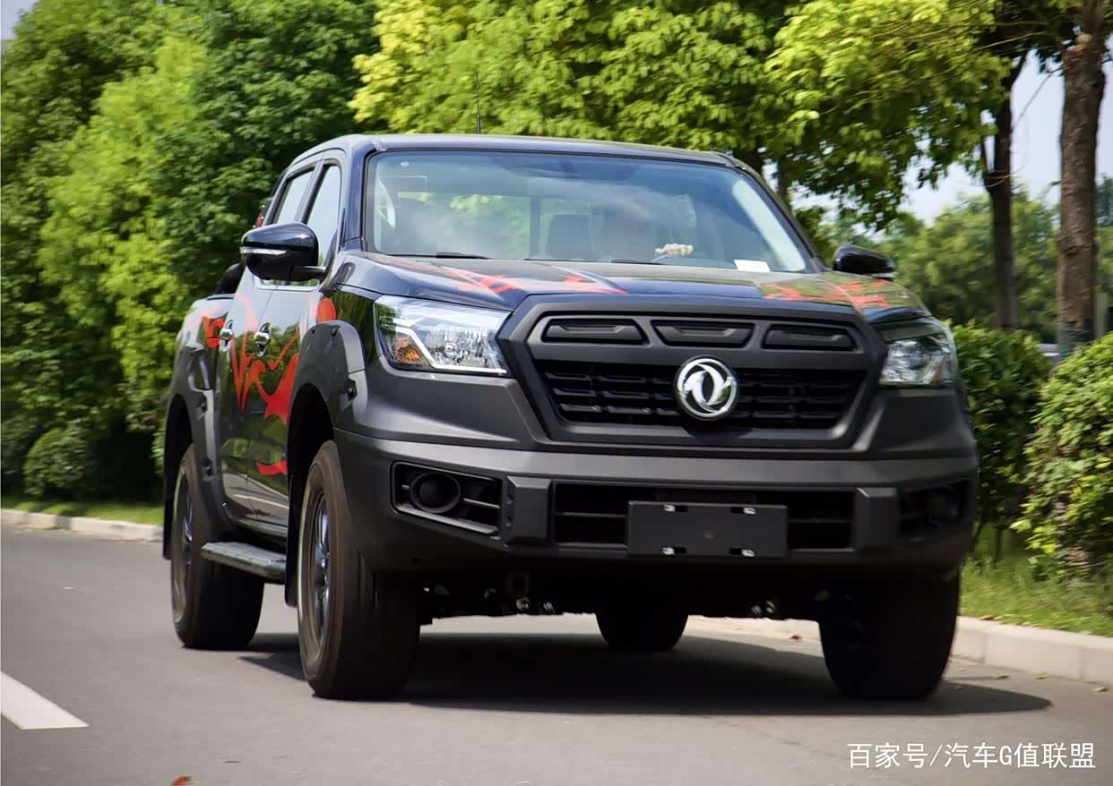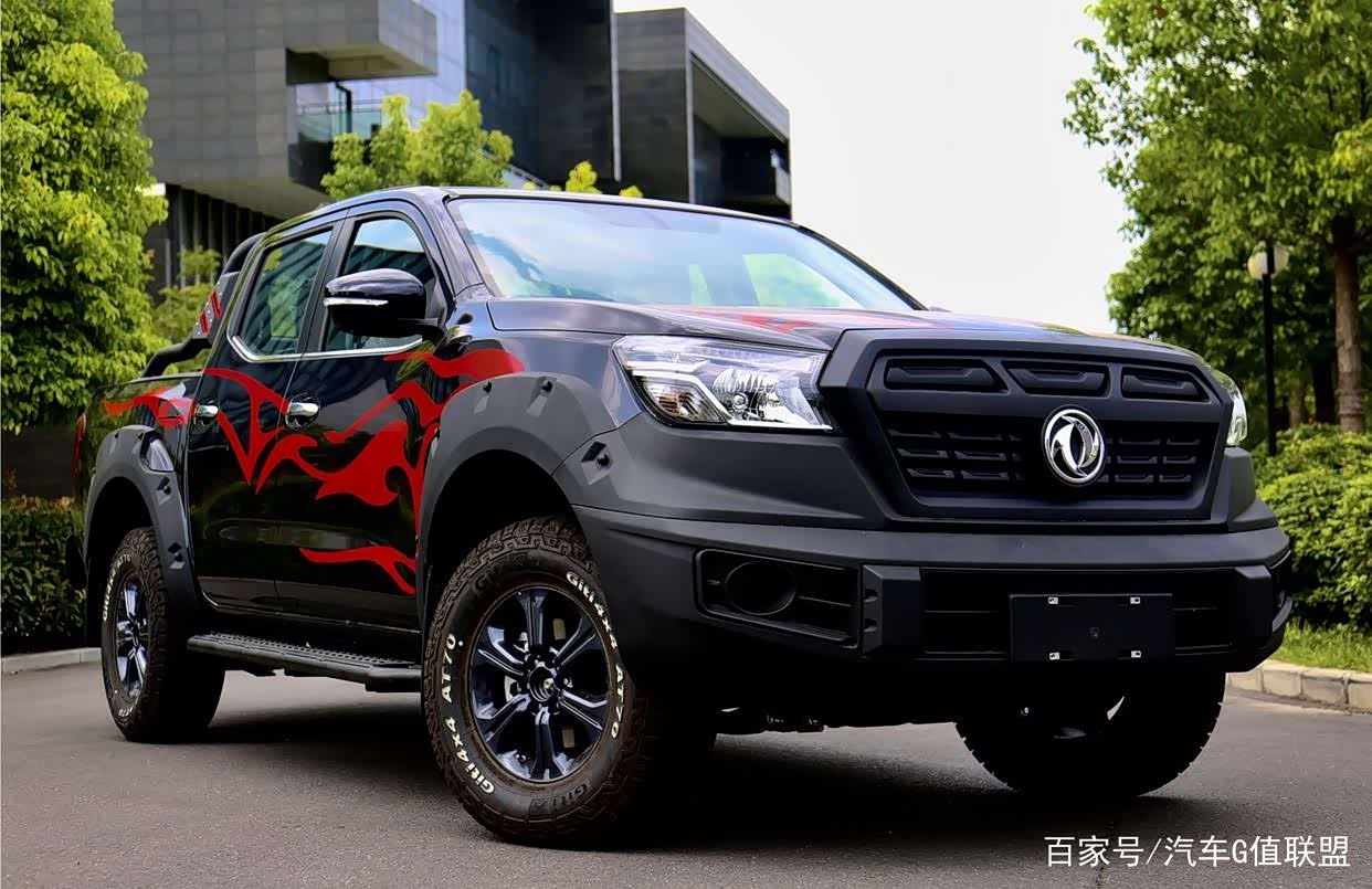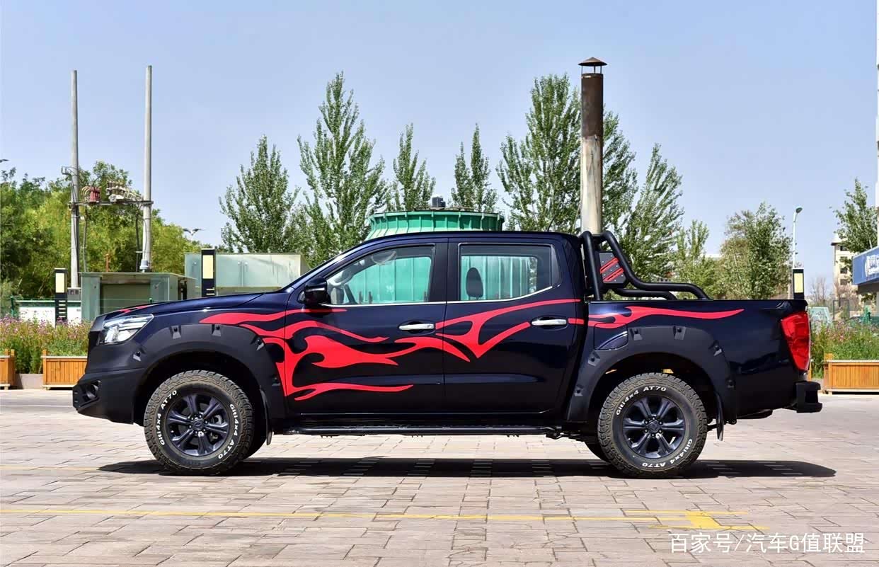 在大体说说日产锐骐6越野版的性能以后,对外观也稍微提下。由于是越野版,车型外观配色有了自己独特的特色,黑色的全车车身用以红色的类似火焰的拉花点缀,显得动感十足。而车头进气格栅以及外轮廓,都采用“暗黑”风格配色,而格栅的外轮廓有粗壮且明显的“饰圈”,再加上类似“竞技前杠”的前包围,一种霸气感由衷而生!而轮眉用黑色高强度朔料材质,并用铆钉固定类似的“拉力赛轮眉”,加上Giti品牌AT轮胎,让整车的野性十足。