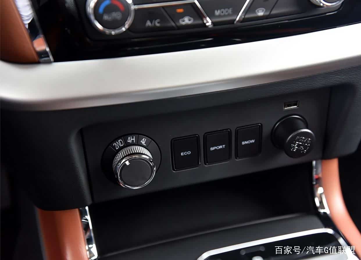 皮实耐操和越野性,是皮卡车型的优势之一!而我的爱车全新锐骐6越野版,在这两个方面做得比较优秀。底盘结构上,全新锐骐6越野版采用前双叉臂独立悬挂,而后面当然是皮卡车型皮实耐操的钢板弹簧!可以说钢板弹簧是皮卡车的灵魂,几乎不用维保,就能承受其他汽车减震弹簧所不能承受的高负载。全新锐骐6匹配的是,来自博格华纳电控分区四驱系统,我的爱车则加了一个越野利器:伊顿后桥差速锁,从而获得更强的通过能力!而在车内,仅仅通过选择2WD、4H、4L旋钮,就可以把车辆在两驱、高速四驱、低速四驱之间选择!当然,需要注意的是,2WD和4H模式,需要在时速80km以下进行切换。而4H到4L之间切换,需要把车辆停下来,并挂在空挡上,以防止切换模式时,对机械系统的冲击,导致机械系统的损坏。