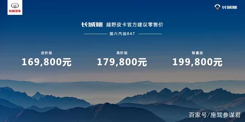 6月13日,2020重庆国际车展开幕, 长城炮(参数|询价)越野皮卡重庆区域上市。首期推出三款国六汽油8AT车型,其中四驱进阶版16.98万元,四驱高阶版17.98万元,四驱限量版19.98万。柴油版车型将于7月上市。