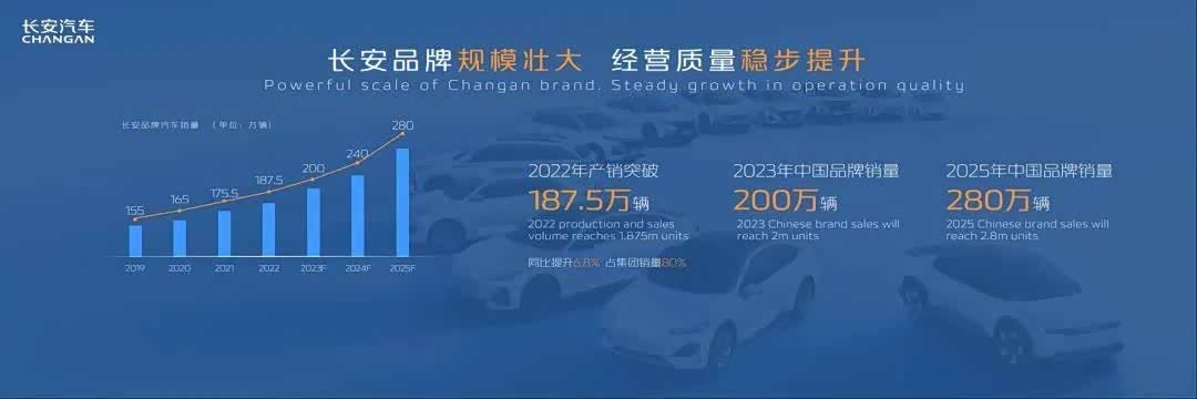 近年来,长安品牌汽车销量逐年大幅提升。2022年,产销突破187.5万辆,同比提升6.8%,占集团销量80%。预计2023年长安品牌汽车销量将突破200万辆。同时长安品牌汽车市占率逐年提升,已从2019年的5.17%上升到2022年的6.98%,今年一季度市占率占全行业的8.54%。经营质量持续向好,其中长安品牌利润占比达85%,成为新的盈利支柱。企业已由规模增长向“规模+效益+价值提升”的高质量发展转变。