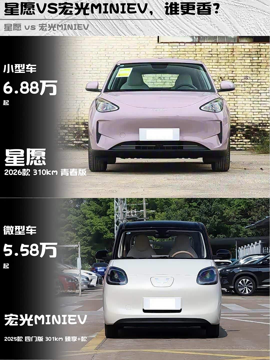 最近在纠结6万级纯电小车怎么选?星愿2026款 310km青春版和 宏光MINIEV(参数|询价) 2025款四门版301km臻享+款深度对比来啦!🔥