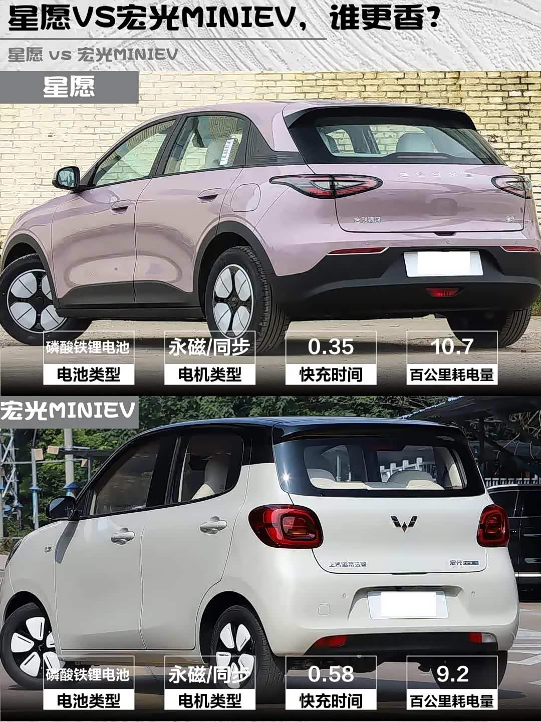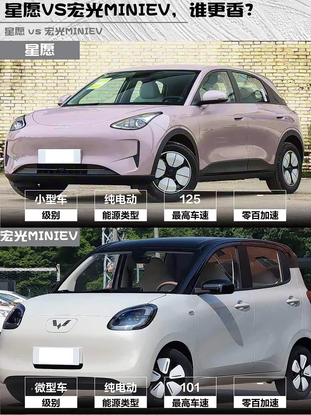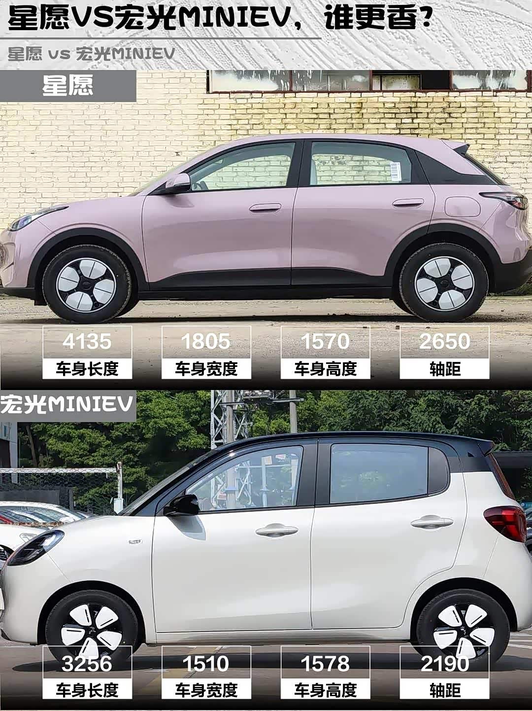 开过就知道差别!星愿后驱设计+电子挡把,起步丝滑得像德芙巧克力🍫 宏光MINIEV胜在3米车身转弯半径小,菜市场窄路会车时确实灵活,但速度上80km/h后会有点飘
