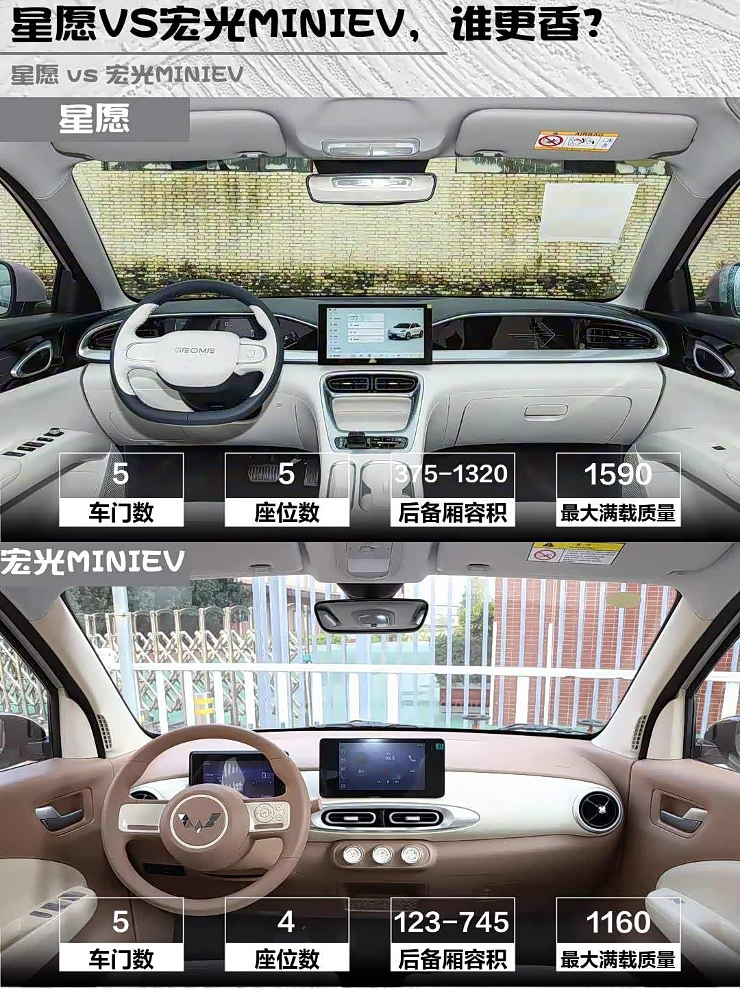 星愿4135mm车长+5座布局,后排实测坐1米8男生膝盖还有余量,周末带全家出游无压力✨ 宏光MINIEV虽然升级了四门版,但3256mm车身还是更适合2-3人短途出行,后排建议坐小朋友更合适