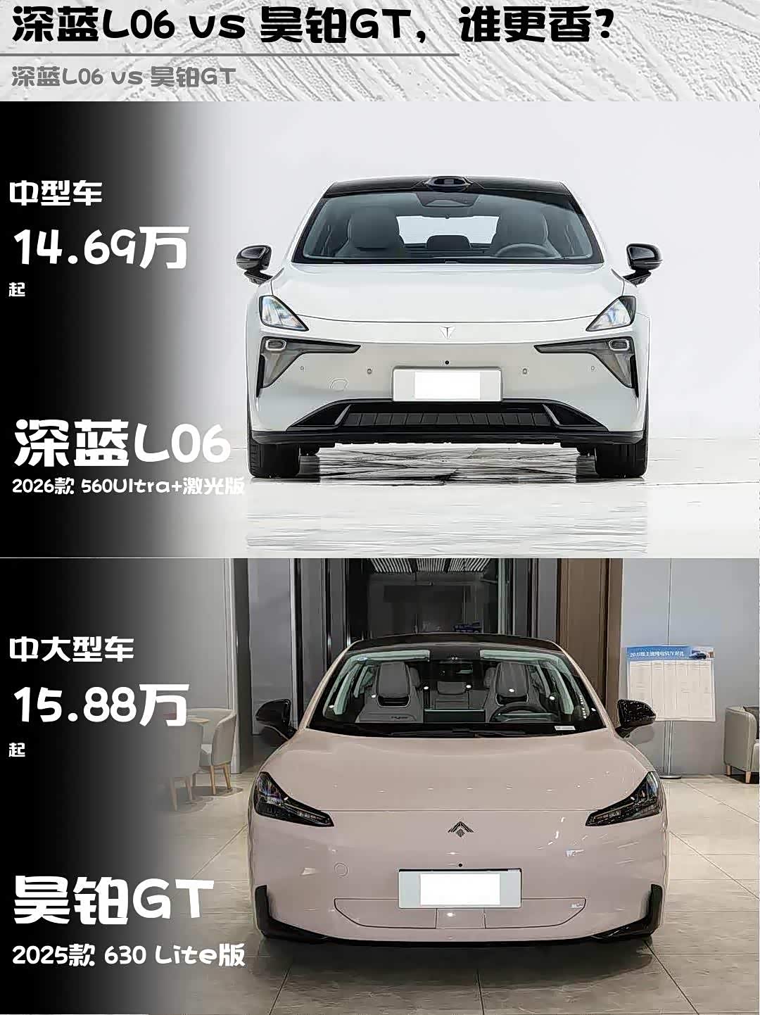 最近深度试驾了两款15万级纯电轿跑——深蓝L06 2026款 560Ultra+激光版和昊铂GT 2025款 630 Lite版,发现这两台车完全走的是不同路线!给纠结的兄弟们来个硬核对比🆚