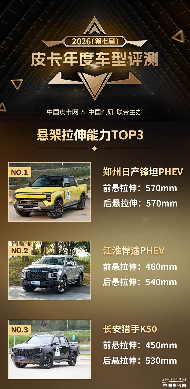 在此前的几期内容中,我们先后为您公布了在2026皮卡年度车型评测中各个小项的测试成绩排名。在评论区中,不少上榜车型都引起了广大皮卡粉丝们的激烈讨论,而对于持币待购的消费者来说,最终的测试结果也为您的购车决策起到了十分重要的参考意义。而本篇文章,我们将为您公布悬架拉伸测试中的“Top 3”,一起来看看究竟有哪三台车上榜吧!