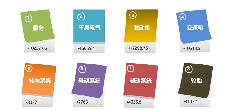 投诉指数:汽车门网全新构建汽车投诉指数计算模型(简称:QCMS),将车型质量投诉分为八大类,根据发动机、变速箱、车身及电气、制动系统、转向系统、悬挂系统、轮胎、服务等问题影响严重性分别赋权,并对集中性事件额外加权,最终形成有效投诉指数,指数越大越严重。