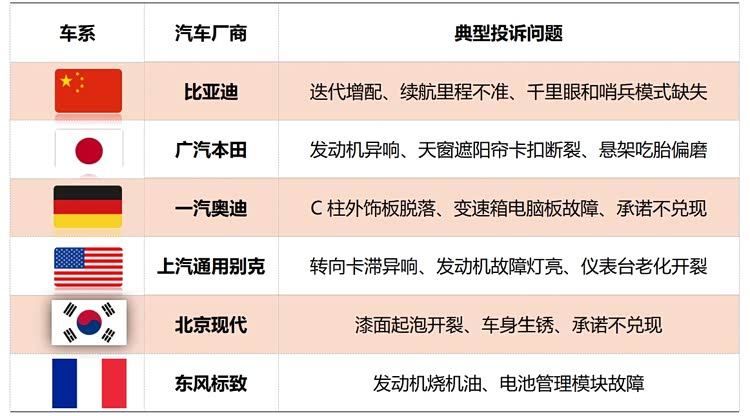 从投诉问题来看,迭代增配、车机老旧不升级、经销商不退订金及承诺不兑现等都是华系车的主要投诉问题。日系车的重点车型是雅阁、飞度、皓影、本田CR-V,悬架吃胎偏磨、发动机异响、部件老化开裂是车主投诉的主要原因。变速箱电脑板故障、轮胎开裂依然是德系车主的“心病”,而美系车的投诉主要围绕转向卡滞异响、发动机故障灯亮、仪表台老化开裂展开。