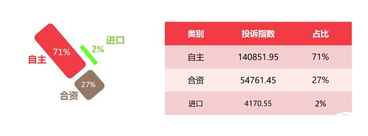 由于比亚迪、理想汽车等车企的投诉指数上涨,自主车企的投诉指数占比由去年的62%上升至71%;合资车企的投诉占比相应由去年的35%下降至今年的27%。与此同时,进口车的投诉指数也同比小幅下滑了1个百分点。