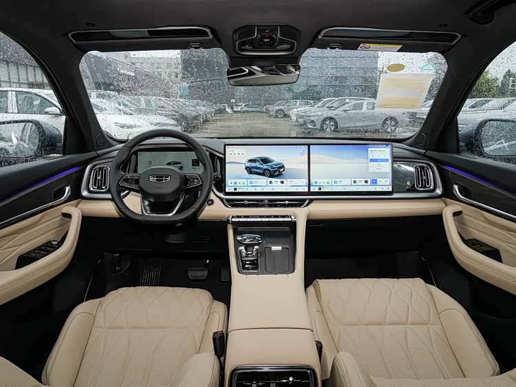 内饰颜色有名流沙金和韶华杏可选,我个人比较喜欢韶华杏内饰,搭配环抱式座舱以及多色氛围灯,看起来宽敞又豪华,12.3英寸全液晶仪表可显示信息丰富,车载智能芯片用的是高通骁龙8155,14.6英寸中控屏支持导航,手机互联,蓝牙/车载电话,车联网,4G网络,OTA升级等功能,14.6英寸的副驾驶娱乐屏功能很齐全,副驾驶仪表台前方设有50W手机无线充电面板,电子挡把的右方设有2个杯架,真皮多功能方向盘左右两侧均是物理按键和滚轮。