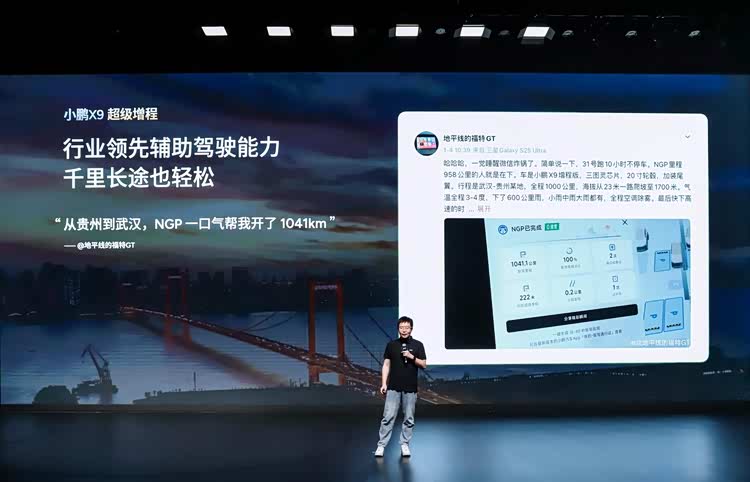 小鹏 X9 超级增程行业第一梯队的辅助驾驶能力,赢得用户高度青睐。拥有2250 TOPS顶级算力,可实现从高速到城区的全场景辅助驾驶覆盖,将驾驶者从疲劳中解放。强大算力更支撑VLM私人管家和全场景VLA功能,让车机系统更智能、更人性化。用户实测小鹏X9超级增程从贵州到武汉1041km一口气直达,未补能未接管。