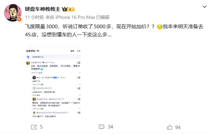 有行业人士透露,新车上市后订单量持续暴涨,目前累计订单已突破5000份,远超3000台的限量额度,部分4S店开始以各种名义收取额外费用。