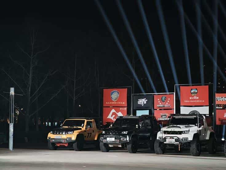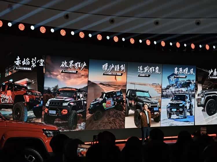 一排 BJ40(参数|询价)在发布会场外点亮车车灯一字排开,