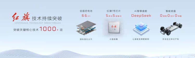 自2023年全面、全方位、全体系向智能网联新能源汽车转型以来,红旗品牌聚力攻坚,突破关键核心技术1000余项。其中,已经完成了66Ah全固态电芯的试制及验证,主要指标达到国际领先水平;推出了中国首颗车规级、5纳米五域融合芯片“红旗1号”;研发了拥有完全自主知识产权的全主动智能底盘,真正做到转弯零侧倾、制动零俯仰、冲击零颠簸。通过一系列技术的创新应用,红旗品牌打造了“天工”纯电、“鸿鹄”混动、“九章”智能三大技术平台,为红旗品牌的持续跃迁打牢了坚实技术底座。