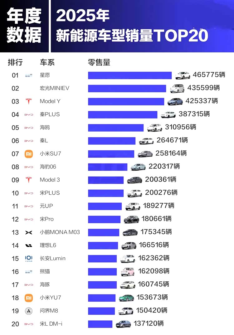 这是去年我国市场销量最高的二十款电动汽车,前三名没有变化,依旧是吉利星愿,宏光MINI EV和Model Y,销量均超过40万台。但这个销量排行榜,最大的黑马不是第一名的星愿,也不是第二名的宏光MINI EV,而是来自特斯拉、比亚迪、小米这三家车企的车型,因为第一第二名的售价极低,导致销售额反而不如其它销量稍微低一些的高价车,净利润的差距更大。